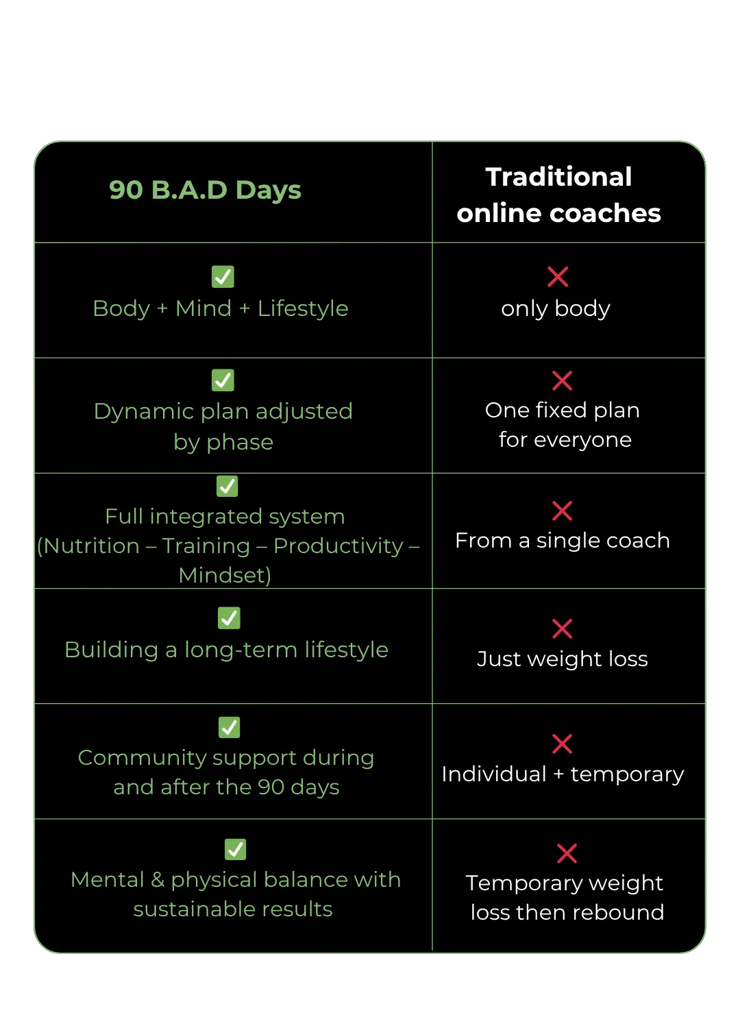 This is not for people looking for quick fixes, shortcuts, or who only care about a “look” even if it destroys their health. It’s also not for those without ambition — we work with people who want to change their lives and push for more.